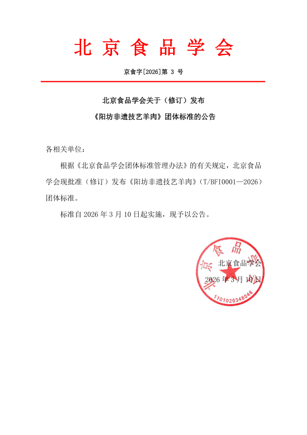 北京食品学会关于(修订)发布《阳坊非遗技艺羊肉》团体标准的公告